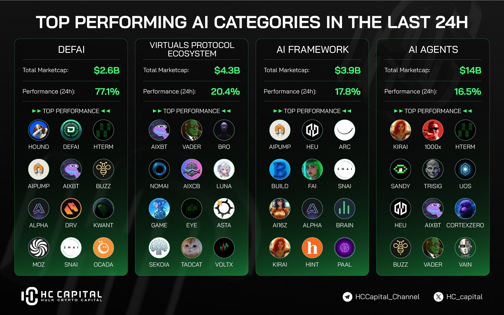 But memecoins? They’re THE hype magnets, with AI agents and DeFAI (DeFi + AI)—their coins have now become the new memecoins due to the sheer volume of excitement/belief they’re enjoying, making them the current echo chamber.
